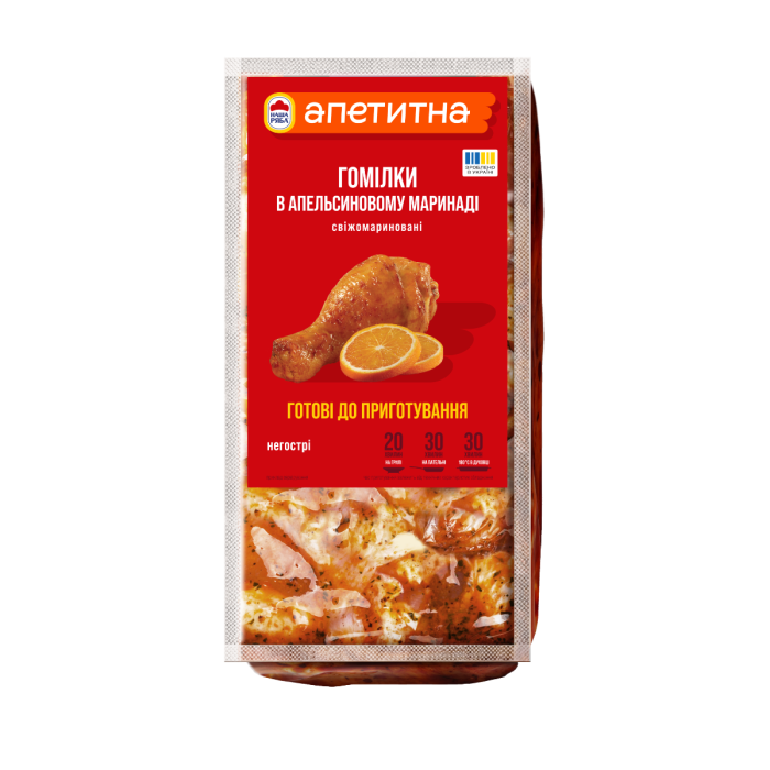 Гомілки в апельсиновому маринаді ТМ Апетитна — це соковита та ароматна страва, яка принесе сонячний настрій та цитрусовий смак на твій стіл. Ніжні курячі гомілки маринуються в апельсиновому соусі, що надає м’ясу неповторного цитрусового аромату та легкої кислинки. Цей оригінальний маринад не лише покращує смак, але й робить м’ясо особливо соковитим та м’яким.