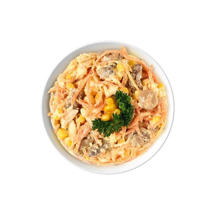 | Ключові інгредієнти | Морква, кукурудза, гриби печериці мариновані, філе куряче, окіст копчено-варений, майонез |