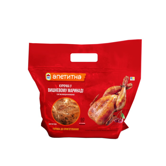 | Склад | Тушка курчати-бройлера 81,7%, вода питна, вишневе пюре 2,5%, цукор, сіль кухонна, олія соняшникова рафінована, спеції та їх екстракти (петрушка, паприка, перець чорний, часник, базилік, гвоздика, касія, мускатний горіх, перець стручковий), регулятор кислотності Е330, ароматизатори (дим, м'ясо), загущувачі (Е415, Е417), стабілізатор Е500, порошок інуліну, консерванти (Е202, Е211). Може містити незначну кількість сої, кунжуту, гірчиці та молочних продуктів. |